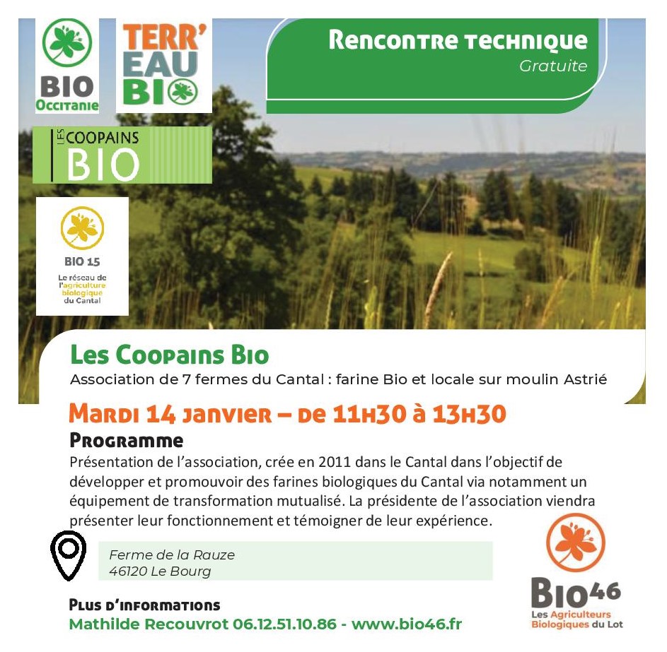 PROGRAMME : Présentation de l'Association, crée en 2011 dans le Cantal dans l'objectif de développer et promouvoir des farines biologiques du Cantal via notamment un équipement de transformation mutualisé.